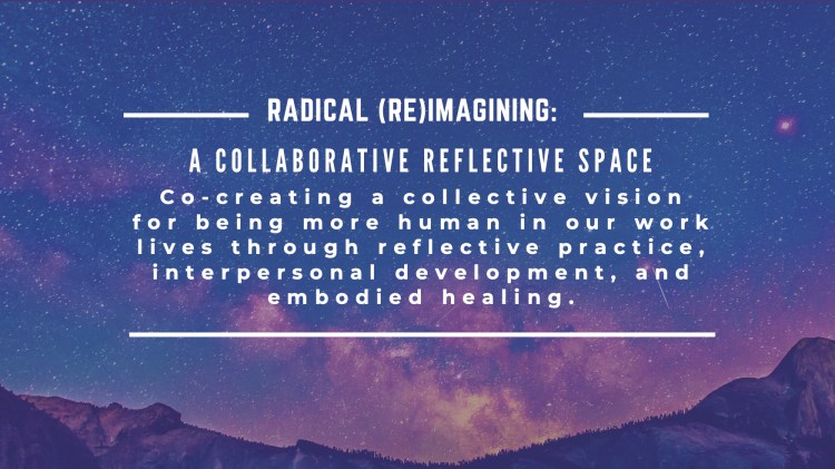 The Frame: As professionals who tend to overvalue expertise, knowledge, the written word, our left brain – – we can sometimes forget that we are human. And that we can be fully human AT WORK. We believe that through reflective practices, interpersonal development, & embodied healing we can allow ourselves to fully express our humanity.