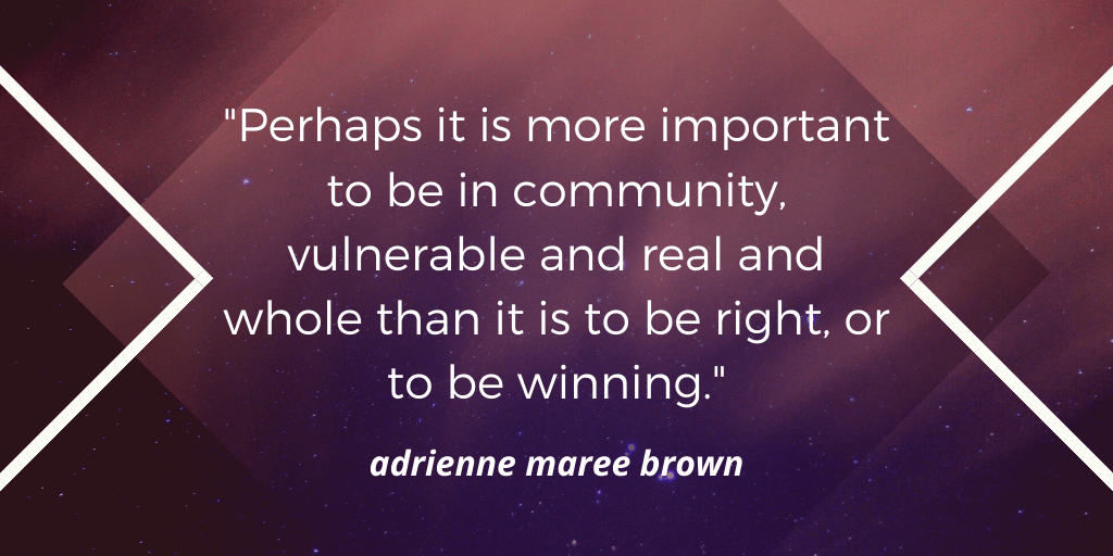 Shared values is the other critical component of community for me. I am learning to have more explicit conversations about values and I am more attuned to situations where values are mismatched. Not all values have to be held equally, but I feel most in community with others who share my values around vulnerability, compassion, & liberation.
